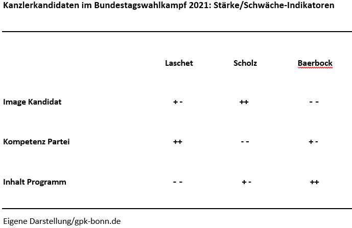 Interessanterweise unterscheiden sich die drei Kandidaten in diesen drei Punkten deutlich voneinander, so dass man meinen müsste, dass den Wählerinnen und Wählern die Entscheidung leicht fiele. Das ist allerdings mitnichten der Fall. Denn wie das nachfolgende – umfragengestützte – Indikatorendiagramm zeigt, erweist sich die Stärke des einen als Schwäche der anderen und umgekehrt:  Schaut man auf das Image der drei Kandidaten, so liegt nach den Umfragen zu urteilen Olaf Scholz klar vor seinen beiden Konkurrenten, am klarsten noch vor Annalena Baerbock, die mit ihren Lebenslaufangaben, den Buchplagiaten und ihrer Kommunikation hierzu sich selbst geschadet hat. Sie hat aber in punkto inhaltlicher Schärfe des Wahlprogramms einen klaren Vorteil gegenüber Scholz und Laschet, deren Parteien bei den Wahlprogrammen allenthalben profilhafte Ehrgeizlosigkeit bescheinigt wird. Diesen dicken Malus-Punkt kann Laschet allerdings wieder dadurch wettmachen, dass seiner Partei nach wie vor in den Umfragen die größte Problemlösungskompetenz zugeordnet wird.