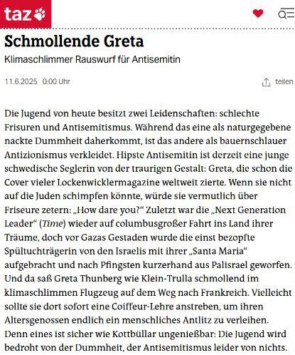 Was aber die taz daraus macht, ist Realsatire: Sie schreibt von „schlechten Frisuren und Antisemitismus“, als wäre das die neue Jugendkultur. In ihrer Not, noch irgendeine linke Deutungshoheit zu behaupten, schlägt sie jetzt auf ihre eigene Ikone ein. Die einstige Jeanne d’Arc des Klimas wird zur schmuddeligen Schulschwänzerin im Antisemitismus-Trainingslager umetikettiert.