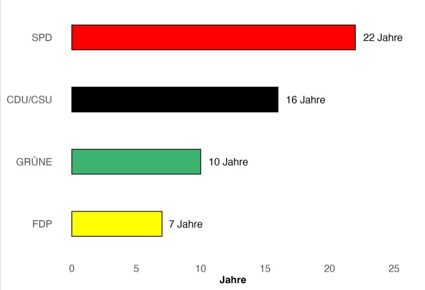 Legende: SPD: 22 Jahre; CDU/CSU: 16 Jahre; GRÜNE: 10 Jahre; FDP: 7 Jahre.